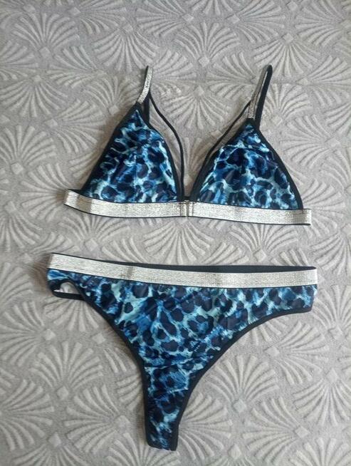 Śliczny, niebieski komplet zdobiony srebrzystymi obszyciami dla pełnych s...apilu kobiet. Nowy. Pasuje na XL/2XL. Wysyłka ...