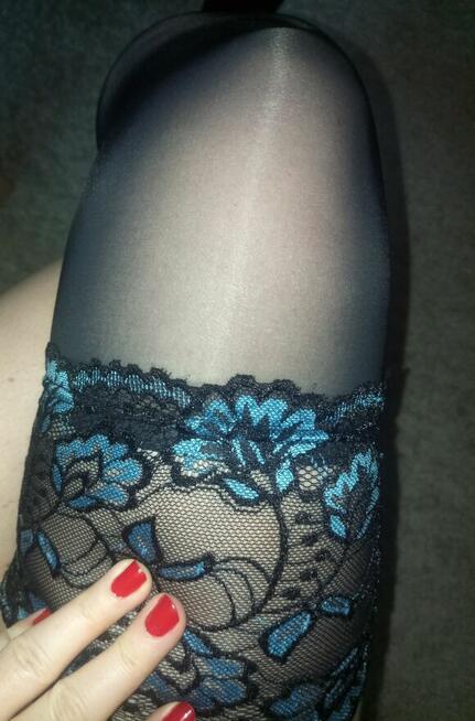 Piękne pończochy olejowe do paska z szeroką koronkowa manszeta w niebiesko-czarnej kolorystyce. Nowe. Rozmiar uniwersalny. ...